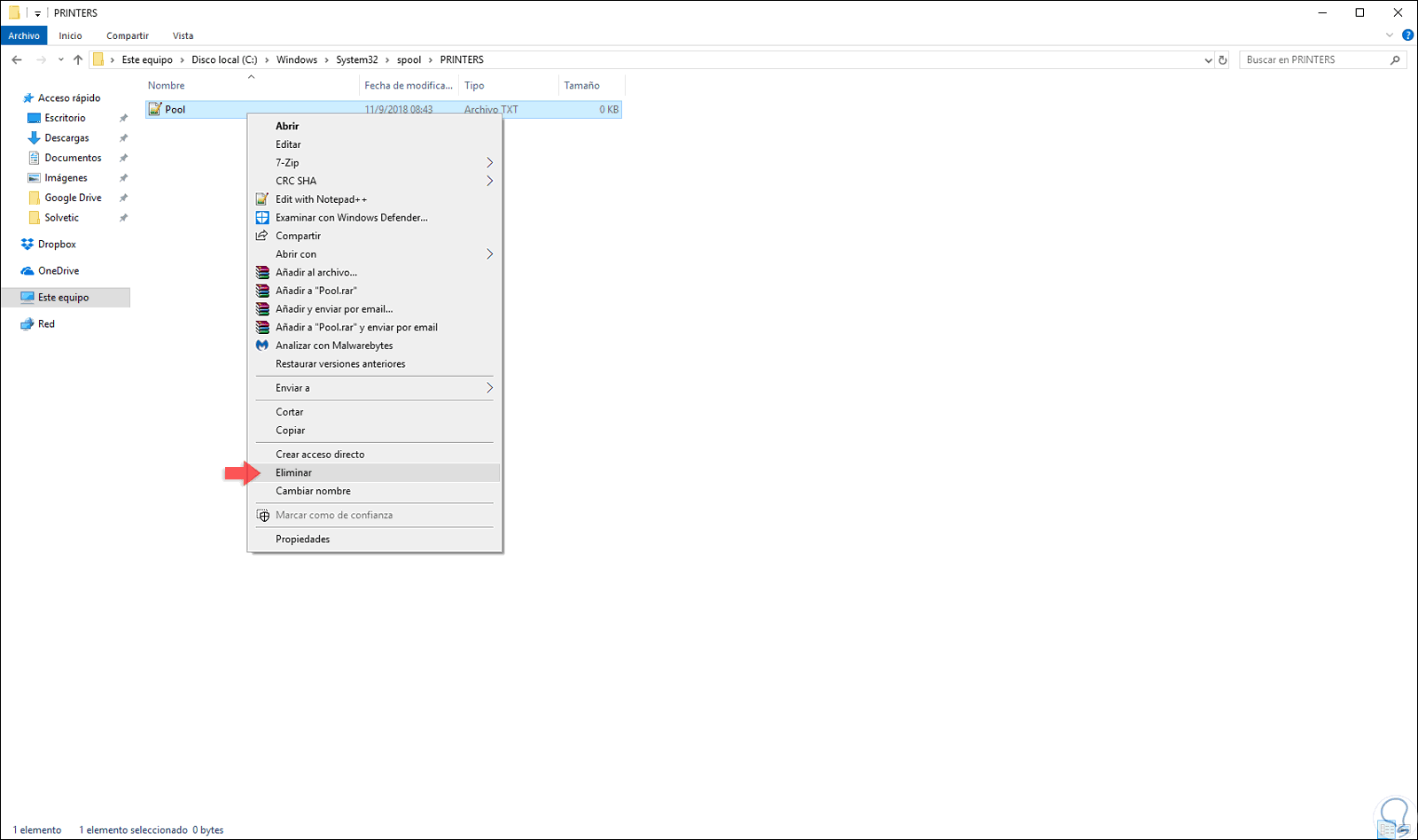 Allí debemos acceder a esta carpeta y borrar todo el contenido de PRINTERS pero no la carpeta en sí. Ahora debemos regresar de nuevo a las propiedades del servicio y pulsar en el botón “Iniciar” para activar el servicio de impresión.