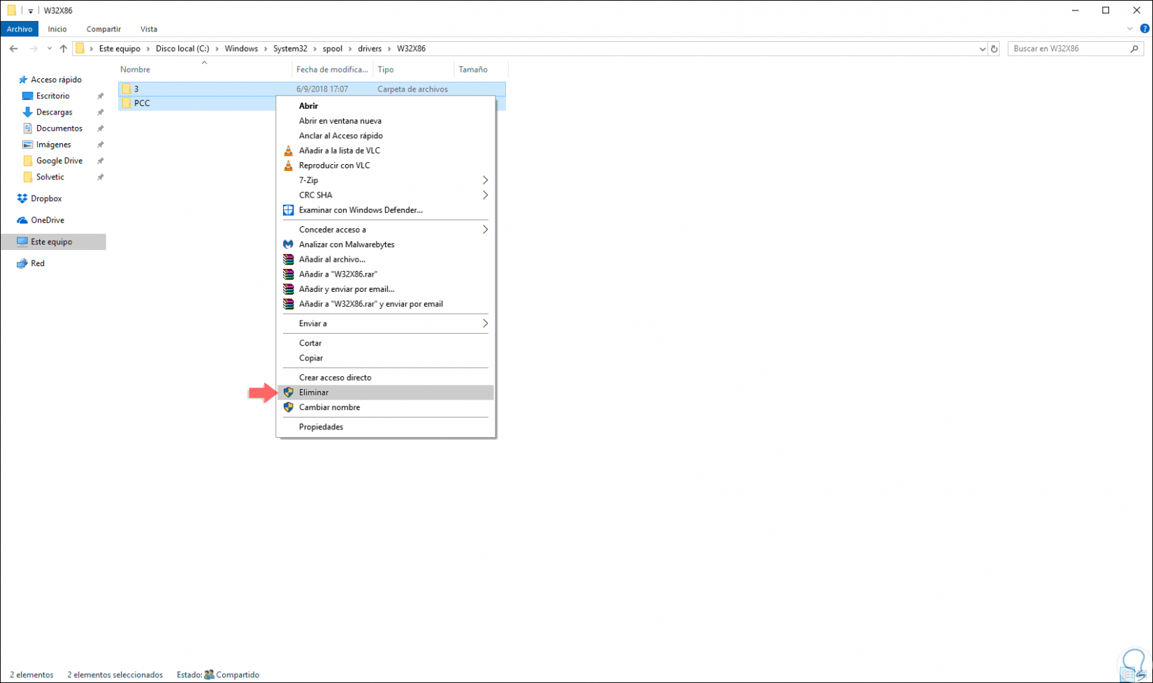 Allí debemos borrar las subcarpetas existentes dando clic derecho sobre ellas y seleccionando la opción “Eliminar”: