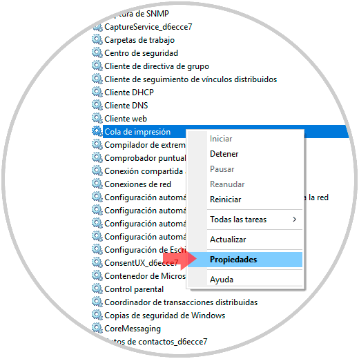 Pulsamos Enter o Aceptar y en la ventana desplegada debemos ubicar el servicio llamado “Cola de impresión”, allí daremos doble clic sobre él o damos clic derecho > Propiedades: