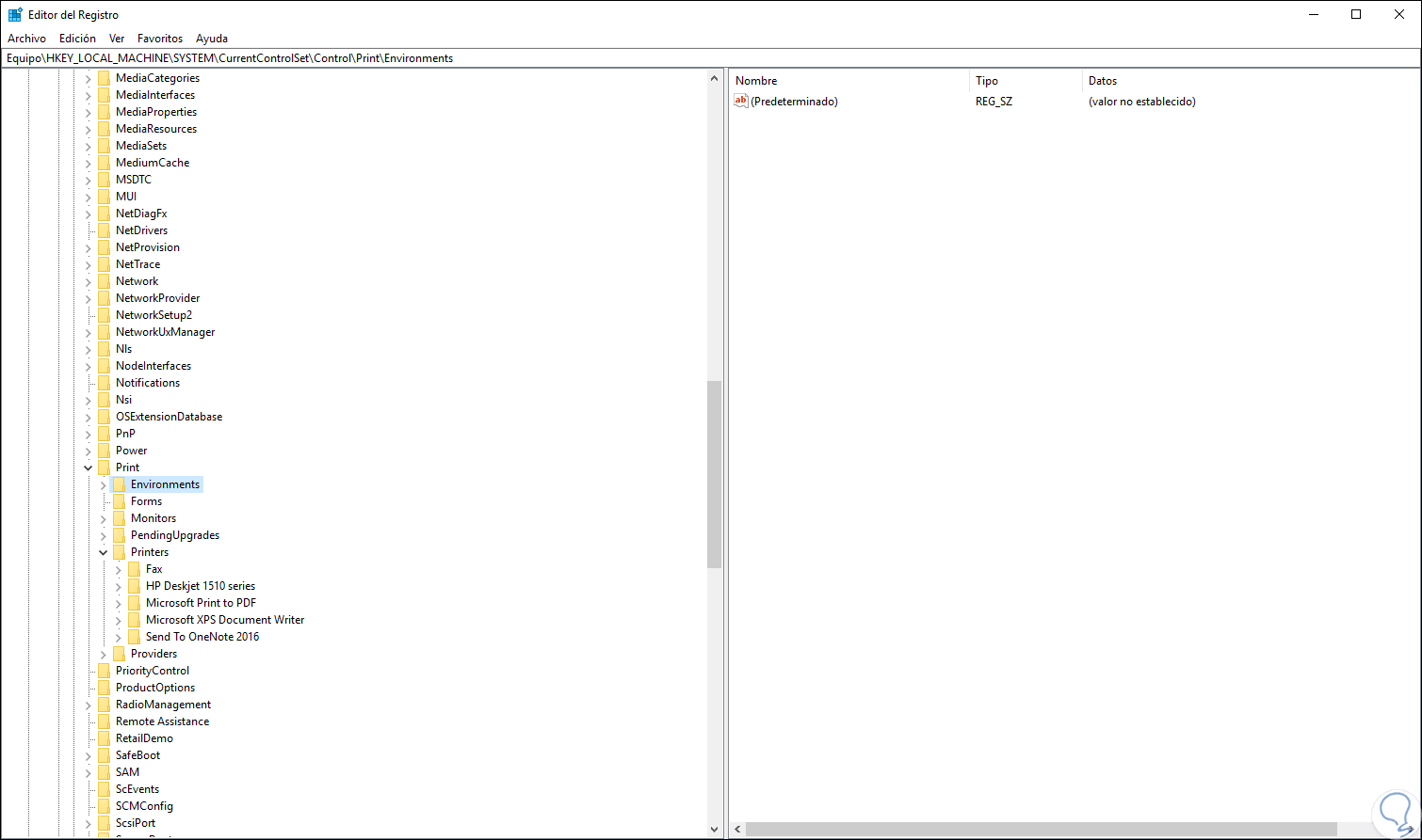 Finalmente iremos a la siguiente ruta. Allí debemos borrar todas las carpetas de las impresoras físicas instaladas mas no las que instala el sistema automáticamente (Microsoft Print to PDF, Send to OneNote, etc).