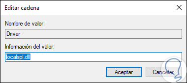 Asignamos el nombre “Driver” y damos doble clic sobre él, luego vamos al campo “Información del valor y allí ingresamos localspl.dll: