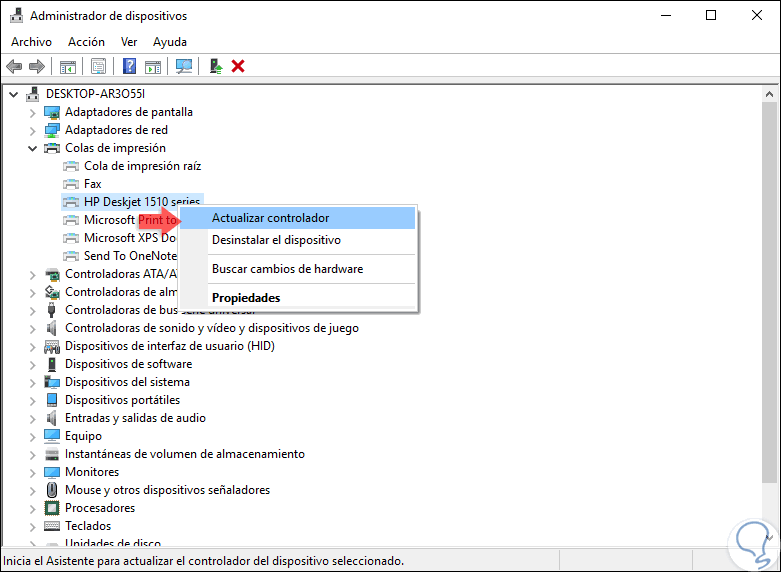 En la ventana desplegada iremos a la sección “Colas de impresión” y allí daremos clic derecho sobre la impresora actual y seleccionamos la opción “Actualizar controlador”.