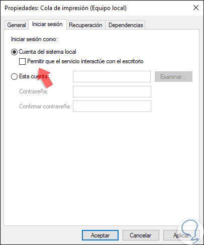 Ahora, otra de las tareas que podemos realizar dentro del servicio de impresión en Windows es evitar la interacción de este con el escritorio, esto, aunque no es común, puede ser causante de que el servicio falle por procesos externos, para deshabilitar esta opción, iremos a la pestaña “Iniciar sesión” y allí desactivamos la casilla “Permitir que el servicio interactúe con el escritorio”: