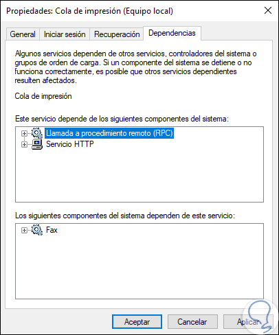 En caso de no ser así, podemos seguir en los servicios de impresión, esta vez vamos a comprobar las dependencias, esto ya que algunos servicios de Windows dependen de otros servicios para su óptimo funcionamiento, de modo que si alguno de los servicios dependientes falla es posible que la impresión también lo haga.