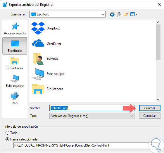 Con esto vamos a crear una copia de seguridad de los registros de esta sección, allí debemos seleccionar la ruta donde se alojará la copia de este registro: