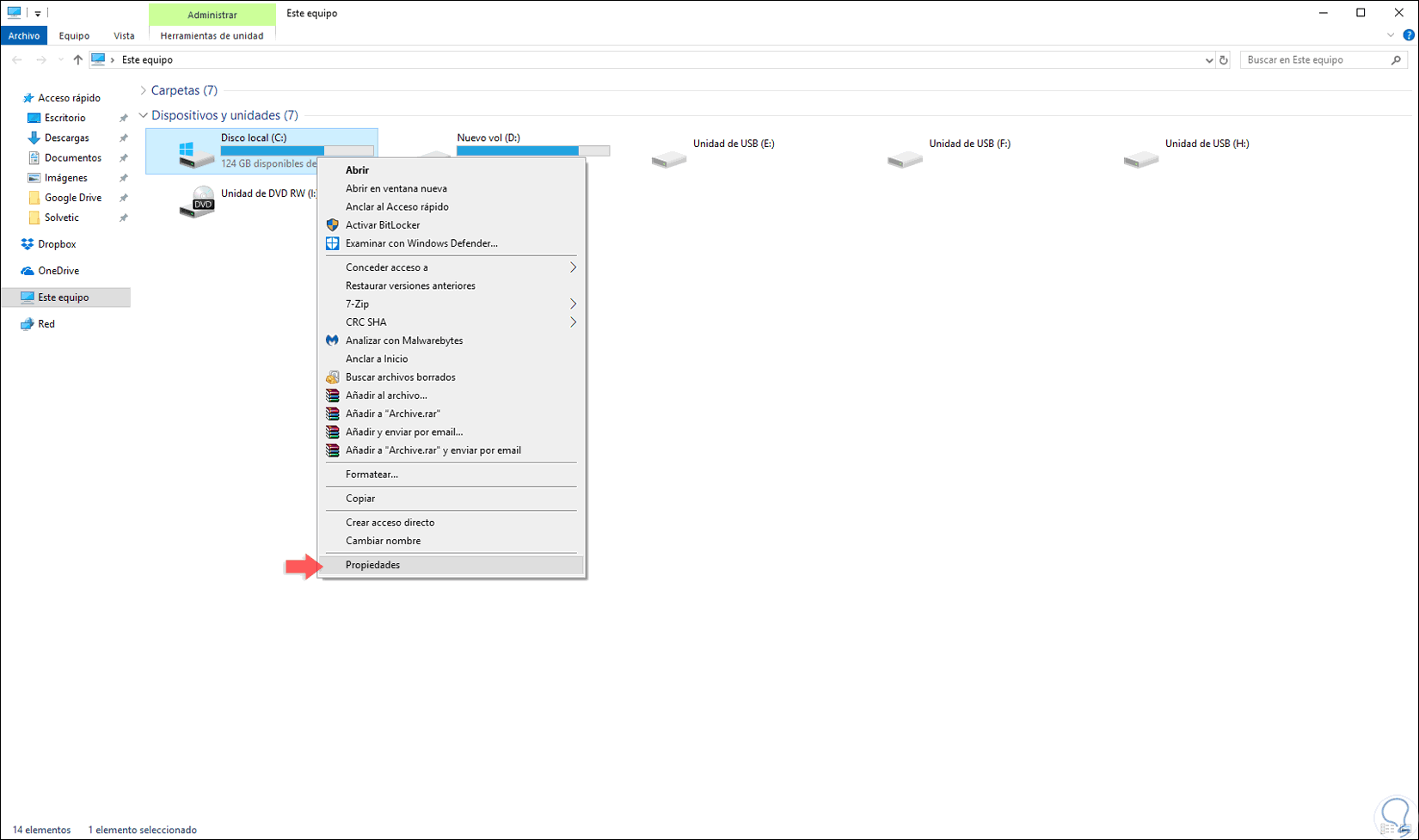 El siguiente paso consiste en ir a la unidad que hemos de compartir, dar clic derecho sobre ella y seleccionar “Propiedades”: