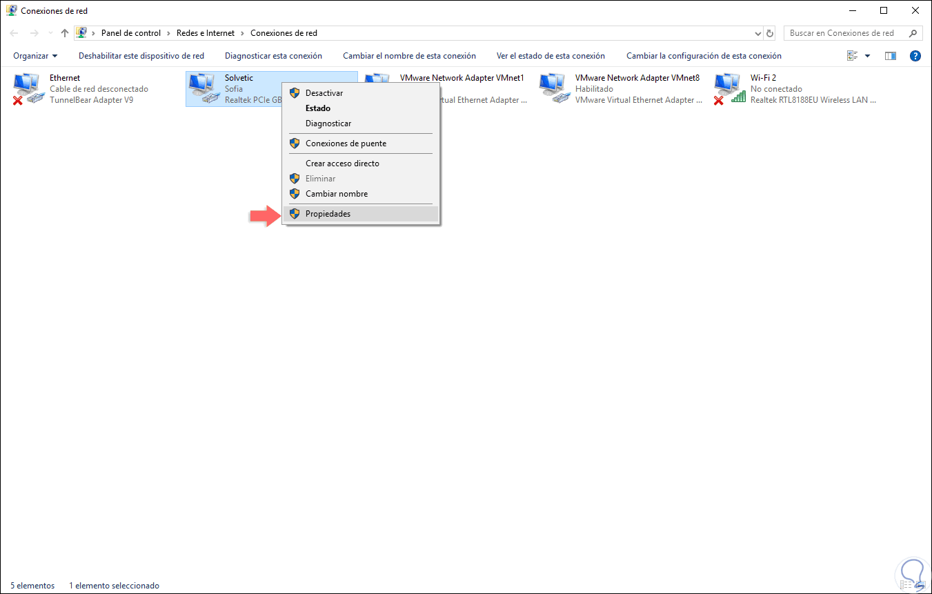 Allí pulsamos en la opción “Cambiar configuración del adaptador” y en la ventana desplegada daremos clic derecho sobre el adaptador de red Ethernet y seleccionamos la opción “Propiedades”: