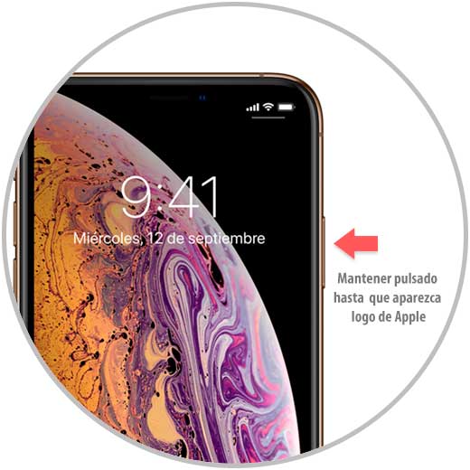Tras estos dos pasos mantén pulsado el botón lateral derecho de tu iPhone XS hasta que aparezca el logo de Appple. Tras ello comenzará el reinicio del terminal que durará unos segundos.