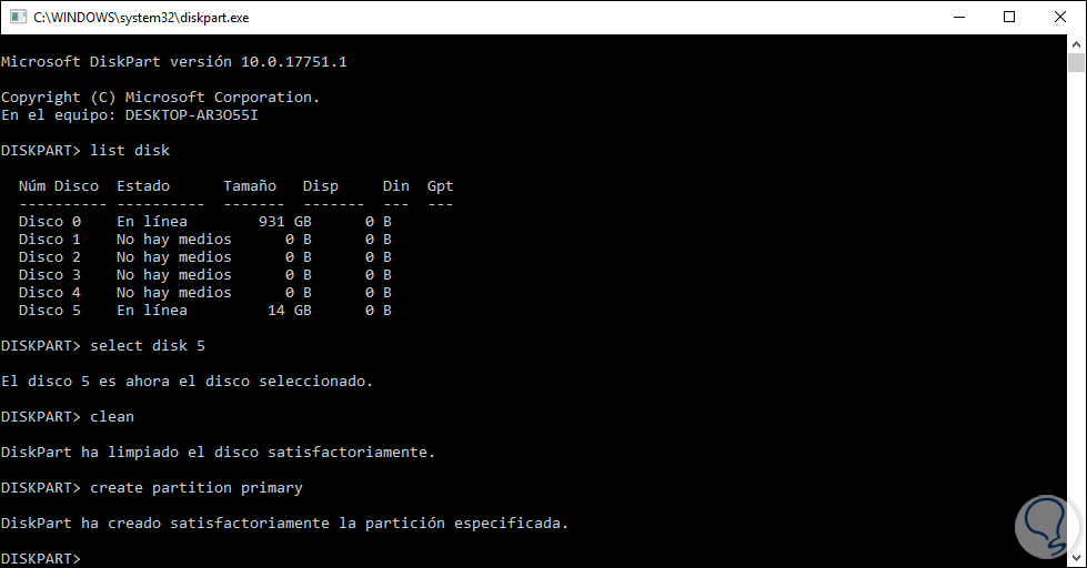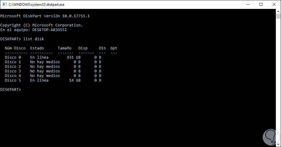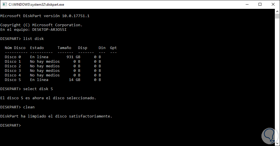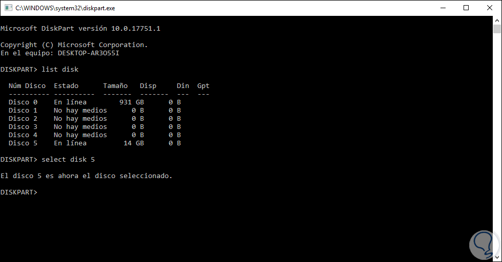 Allí detectamos nuestra tarjeta SD, en este caso se denomina Disco 5, ahora será necesario seleccionarlo, para ello ejecutamos: