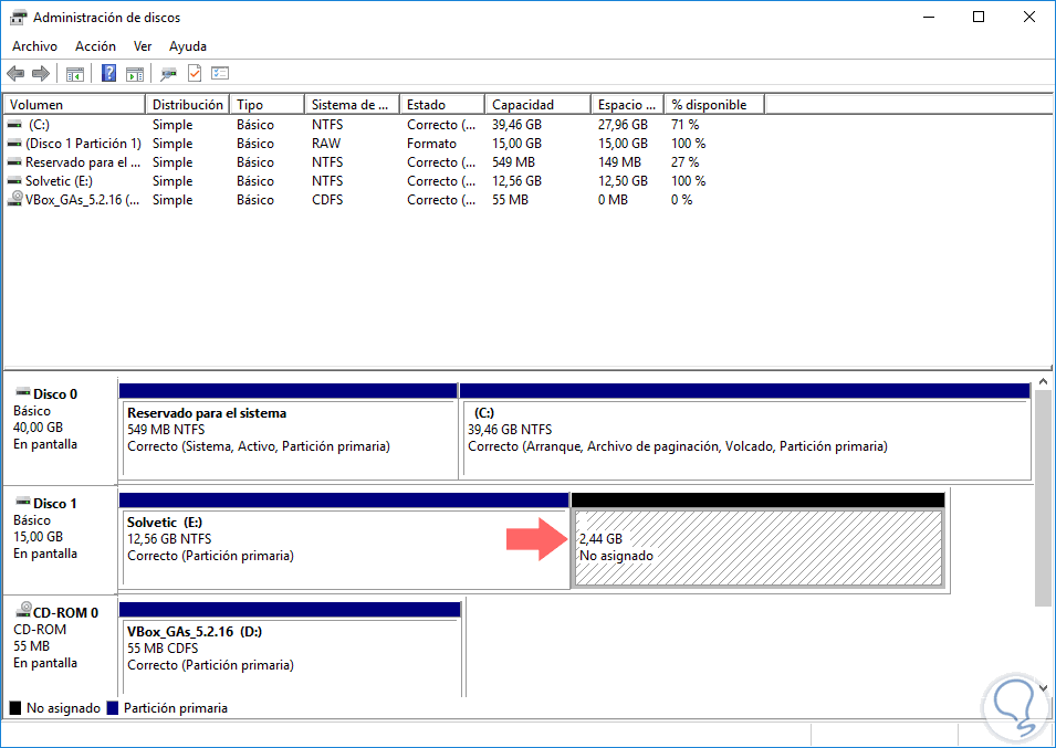 Al acceder al administrador, veremos todas unidades conectadas al equipo junto a su respectivo espacio, en caso de que la tarjeta SD hay sido administrada por algún sistema diferente, podremos ver junto a ella una sección llamada No asignado junto a la capacidad de dicho espacio: