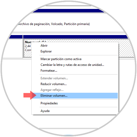 Cuando detectemos esta opción de espacio sin asignar en el administrador de discos de Windows 10, será posible recuperar ese espacio inutilizado dando clic derecho en la partición y elegir la opción Eliminar volumen: