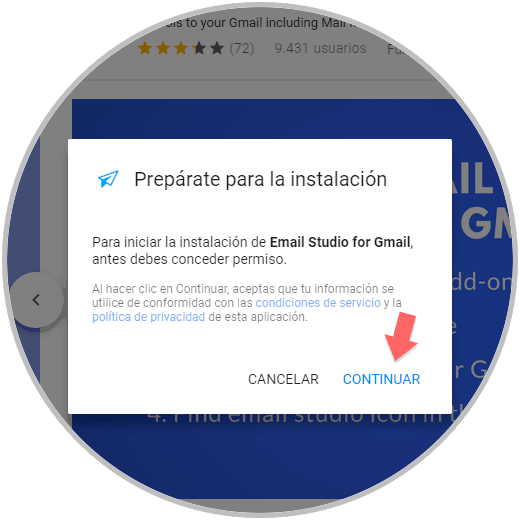 Allí pulsamos en el botón “Instalar” para llevar a cabo el proceso de instalación de este complemento para Gmail:
