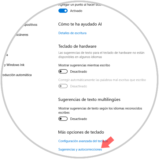En la nueva ventana iremos a la sección "Escritura" y en las opciones desplegadas iremos hacia la parte inferior donde encontramos la opción "Sugerencias de texto multilingües":