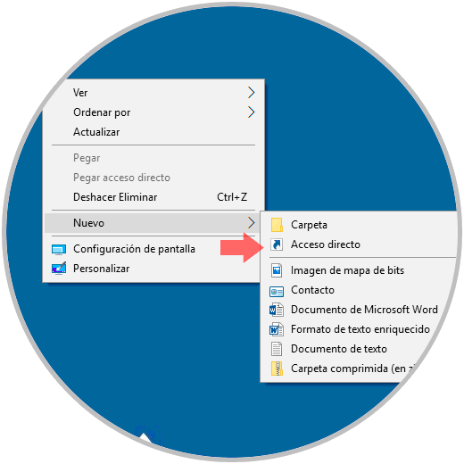 Para iniciar este proceso, pulsamos en algún lugar libre del escritorio y seleccionamos la opción “Nuevo / acceso directo”: