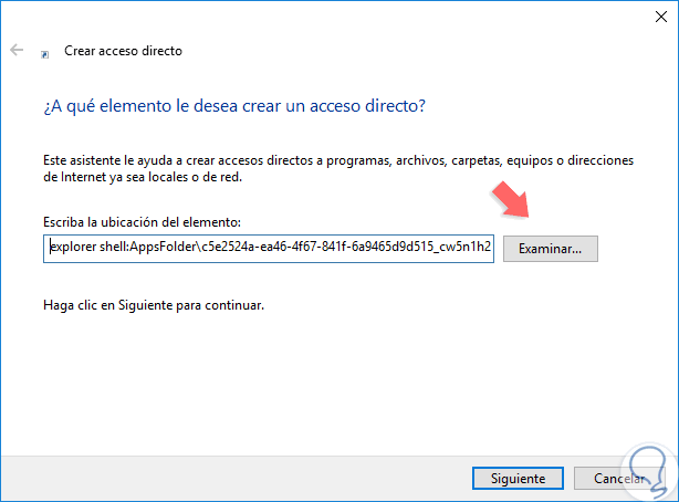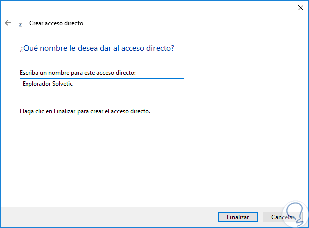 Este valor nos dará acceso al nuevo explorador de archivos de Windows 10, allí damos clic en Siguiente y asignamos el nombre deseado para el acceso directo: