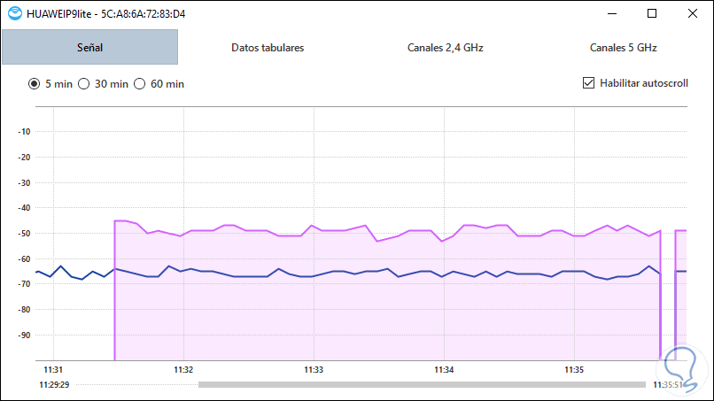 - Posee gráficos de ruido y nivel de señal personalizables los cuales despliegan los cambios en tiempo real