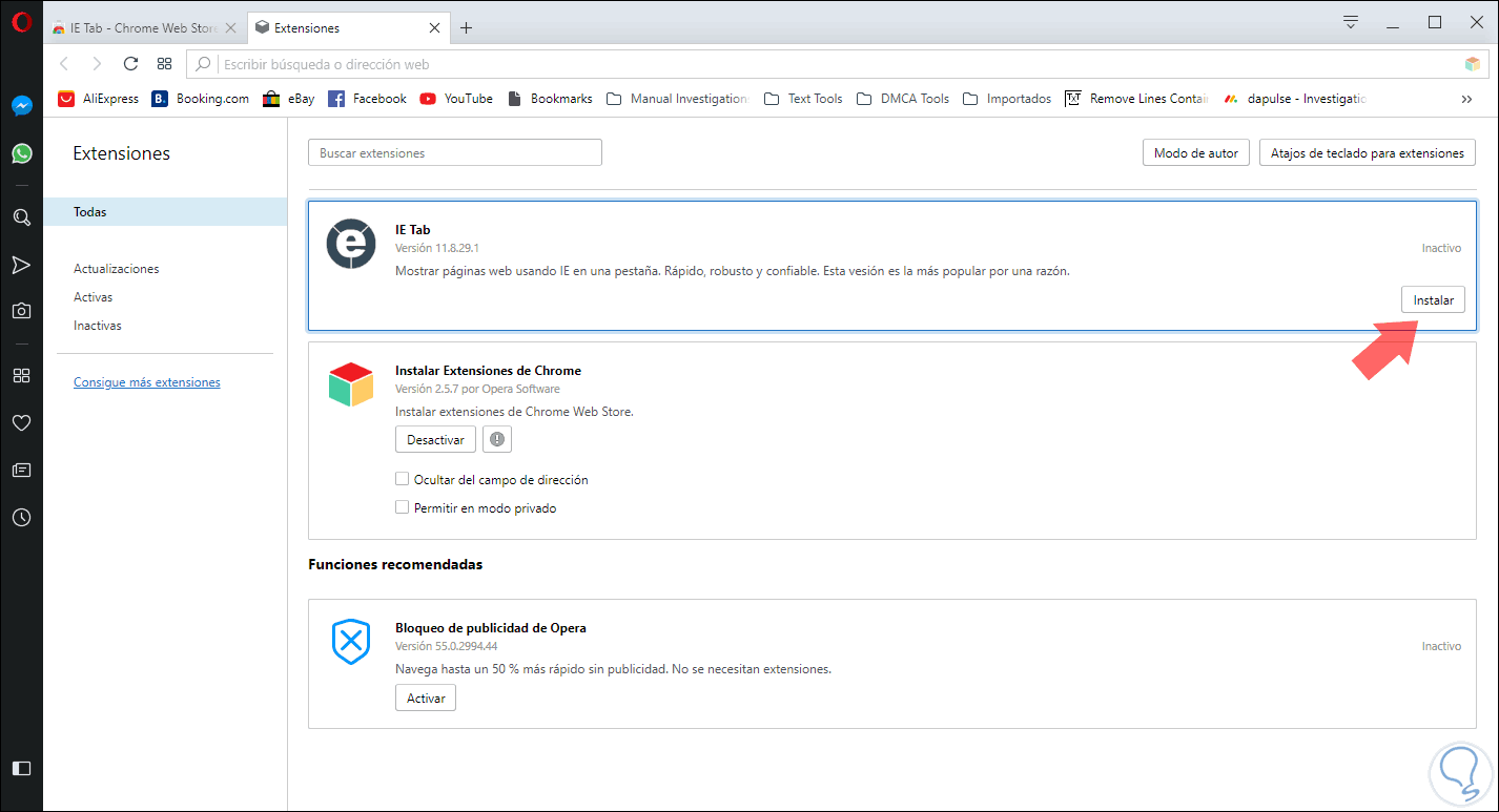 Pulsamos en Aceptar y seremos redireccionados a la sección de extensiones de Opera donde veremos IE Tab y pulsamos en el botón Instalar para completar la acción:
