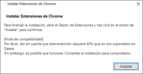 Pulsamos en el botón Add to Opera y será desplegado el siguiente mensaje:
