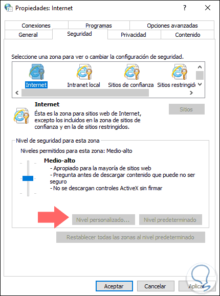 Allí seleccionamos la línea Opciones de Internet y en la pestaña Seguridad seleccionar Internet y pulsar, si está habilitado, la opción Nivel personalizado y posteriormente habilitar Java desde allí.
