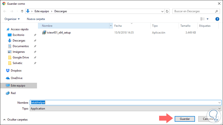 En la parte superior veremos un pequeño botón "e" en la lista de extensiones del navegador, daremos clic en el icono "e" y la extensión IE Tab descargará un archivo llamado ietabhelper.exe. Procedemos a guardar este archivo, este es un archivo ejecutable requerido por IE Tab para ejecutar y llevar a cabo las funciones de forma correcta.