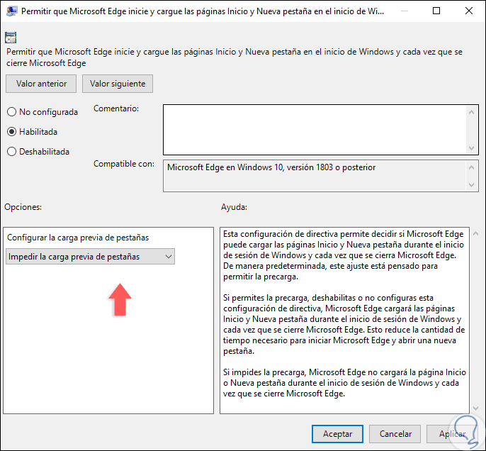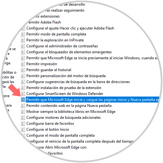 En el panel central de políticas ubicamos la política llamada “Permitir que Microsoft Edge inicie y cargue las paginas Inicio y Nueva pestaña en el inicio de Windows y cada vez que se cierra Microsoft Edge”: