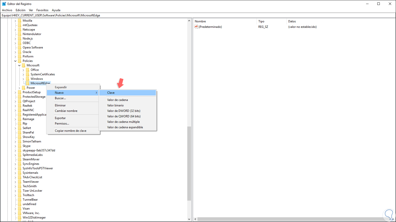 En caso de que no exista la clave “TabPreloader” la crearemos dando clic derecho sobre “MicrosoftEdge” y seleccionando la opción “Nuevo / Clave”: