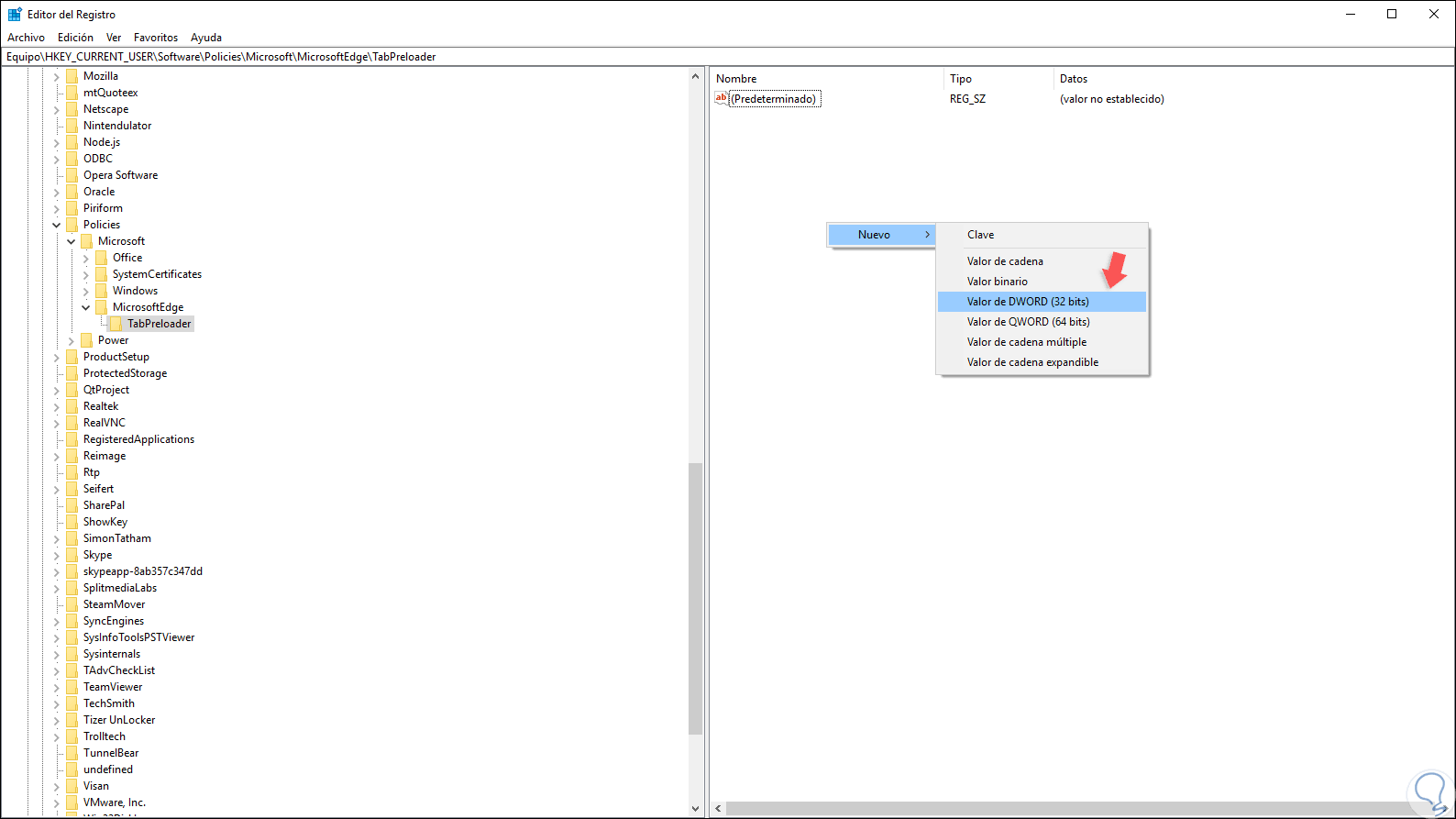 Ahora, daremos clic derecho en la clave TabPreloader y seleccionamos la opción “Nuevo / valor de DWORD (32 bits)”: