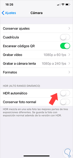 Veremos varias opciones. En este caso debemos desplazarnos hasta la sección HDR para poder desmarcar el modo automático de esta opción.