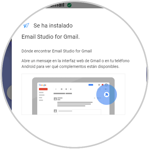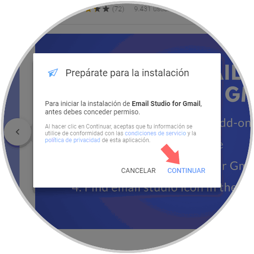 Allí damos clic en la línea Continuar para completar el proceso de instalación de este complemento en Gmail.