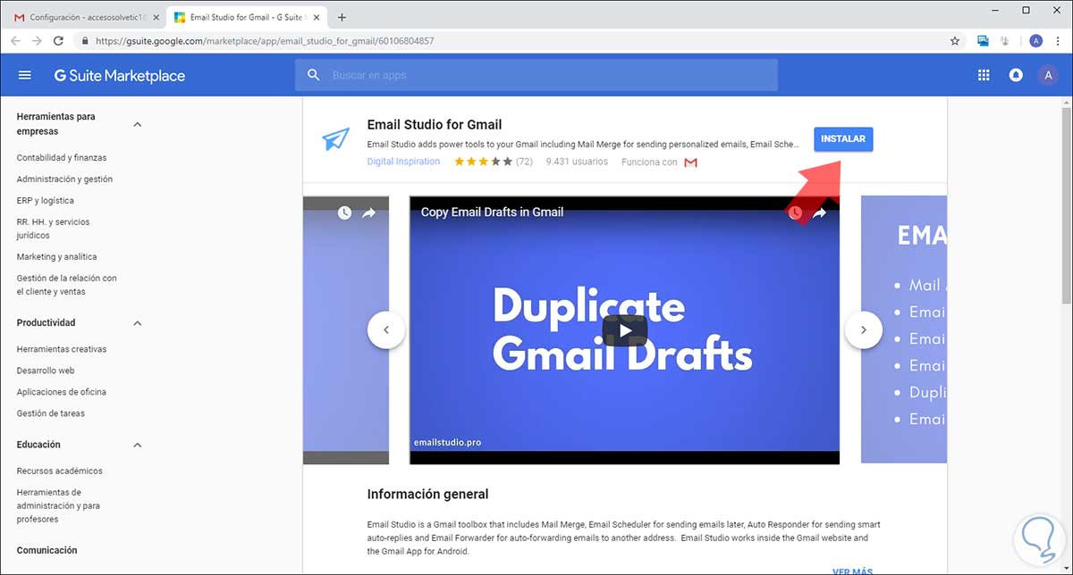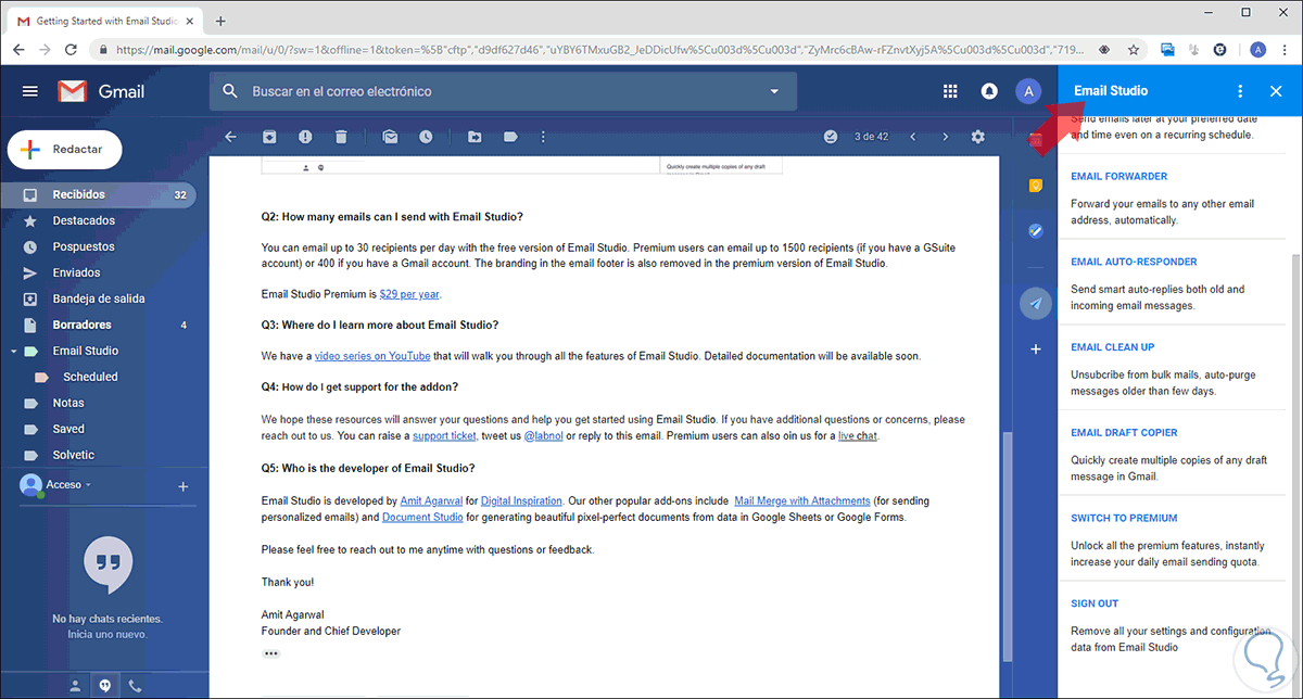 Para habilitar esta opción en Gmail, será necesario abrir algún correo electrónico ubicado en la bandeja de entrada con el fin de que se habilite la opción de Email Studio en el costado lateral derecho: