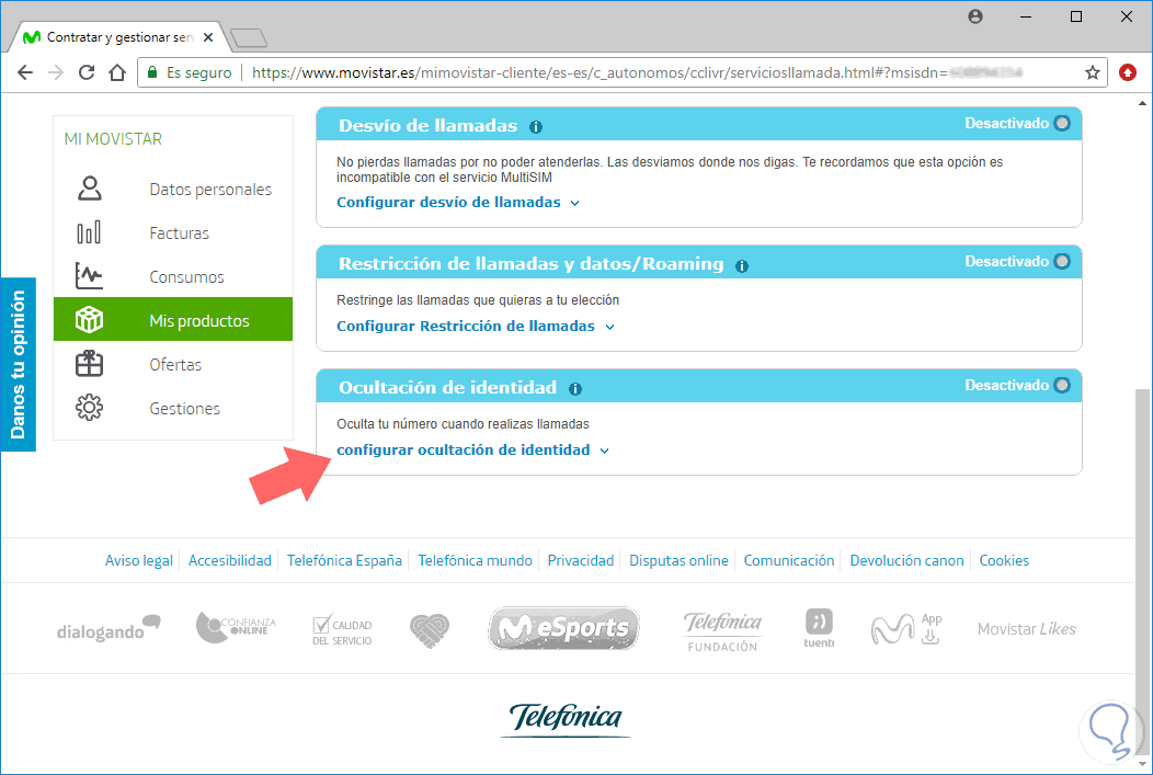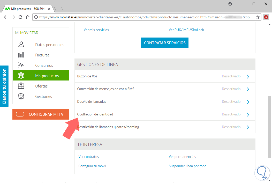 A continuación, vas a ver una nueva ventana en la que haya varias opciones. Debes situarte en la pestaña “Gestión de líneas” y seleccionar “Ocultación de identidad”