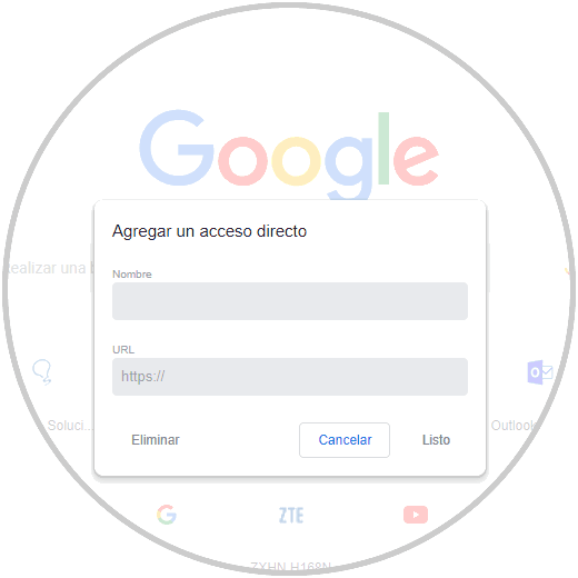 Al pulsar en este botón veremos que se despliega lo siguiente. Allí podemos ingresar el nombre y dirección URL del sitio que deseamos añadir a la nueva pestaña de Google Chrome.
