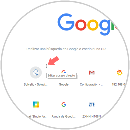 Otra de las opciones disponibles, es que es posible editar los accesos directos que ya están disponibles en la nueva pestaña de Google Chrome. Para ello ubicamos el mouse sobre alguno y debemos dar clic en los tres puntos que serán desplegados: