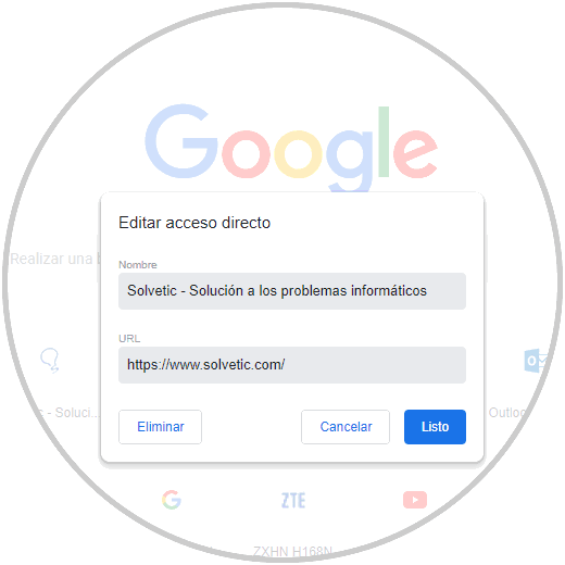 Al pulsar en el botón "Editar acceso directo" será desplegado lo siguiente. Allí podremos cambiar el nombre y URL según sea necesario.