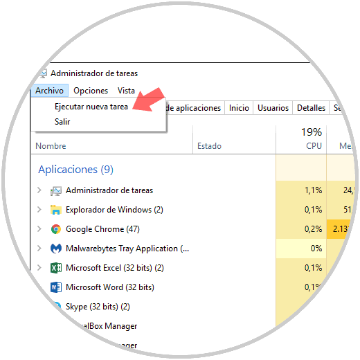 Para crear una nueva cuenta de usuario de forma rápida, podemos ir al "Administrador de tareas" y allí ir al menú "Archivo" y seleccionar la opción "Ejecutar nueva tarea":