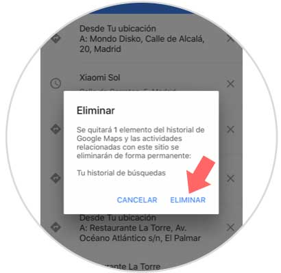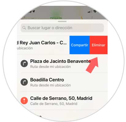 Para borrar rutas realizadas hay que despalzar hacia la izquierda aquella dirección que queramos borrar en color gris. Veremos que aparece compartir o eliminar y en este caso debemos pulsar en "Eliminar"