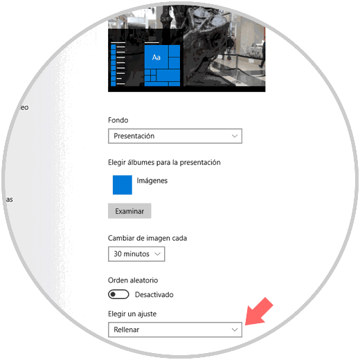 En la ventana desplegada seleccionamos la opción "Presentación en el campo Fondo", seleccionamos las bibliotecas donde están alojadas las imágenes a desplegar, definimos la frecuencia con la cual cada imagen será modificada y en el campo "Elegir un ajuste" definimos la opción "Rellenar":