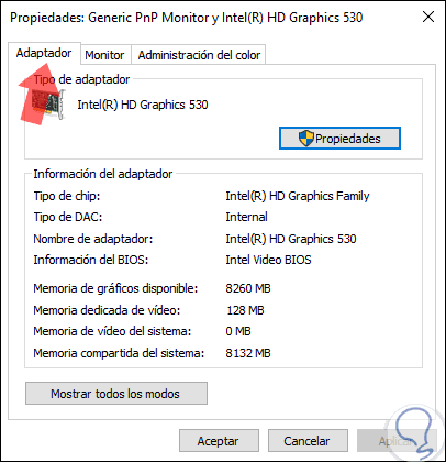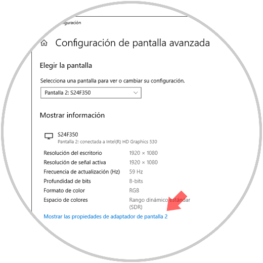 Al dar clic sobre la línea "Mostrar las propiedades de adaptador de pantalla" ubicada en la parte inferior.