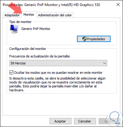 Accederemos a la siguiente ventana donde será posible ver las propiedades del monitor en la pestaña "Adaptador":
