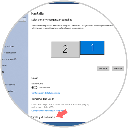 Se desplegará la siguiente ventana donde pulsamos en el botón "Identificar" para tener certeza que número asigna Windows 10 a cada monitor. Esto nos permite saber con certeza sobre cual monitor estamos trabajando y que configuración de ha de aplicar. Una vez seleccionado el monitor iremos a la sección "Escala y distribución"