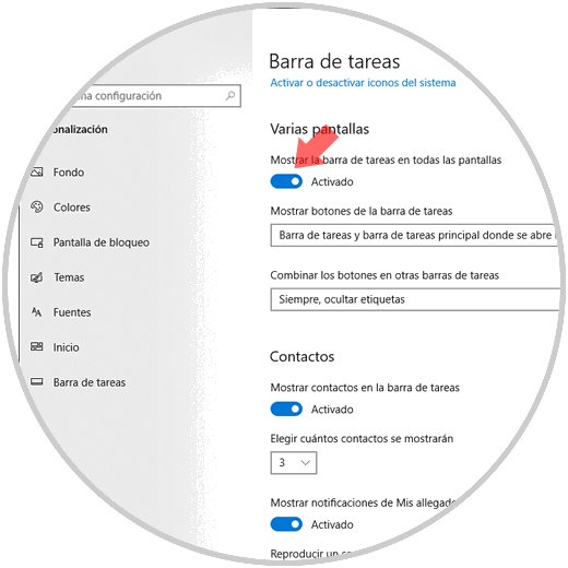 Se desplegará la siguiente ventana y allí iremos a la sección "Varias pantallas". Allí pulsamos en el interruptor "Activado" en la sección "Mostrar la barra de tareas en todas las pantallas" para evitar que esta sea desplegada.