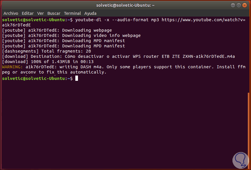 Ahora, existen una opción para descargar el audio MP3 de estos videos ya que por derechos de Google no es posible descargar estos videos directamente de YouTube. Adicional, al descargar solo el MP3, podemos cargarlo a nuestros dispositivos móviles para escucharlos en cualquier momento y en cualquier lugar aun sin una conexión a internet. El proceso para descargar el audio Mp3 de un video de YouTube es posible gracias a una herramienta llamada YouTube-DL y hoy Solvetic explicará como hacer uso de ella para este proceso de descarga.