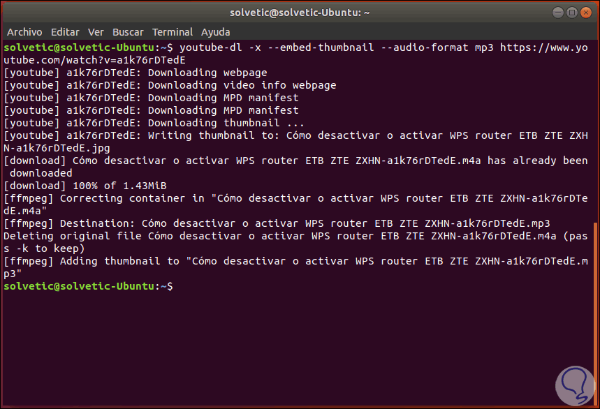 Si deseamos añadir una portada para el archivo mp3, podemos agregar la opción --embed-thumbnail así: