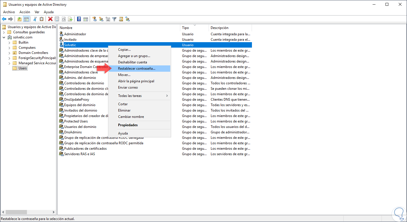 En la ventana desplegada, ubicaremos al usuario sobre el cual se ha de aplicar el reseteo de la contraseña, daremos clic derecho sobre él y seleccionamos la opción “Restablecer contraseña”: