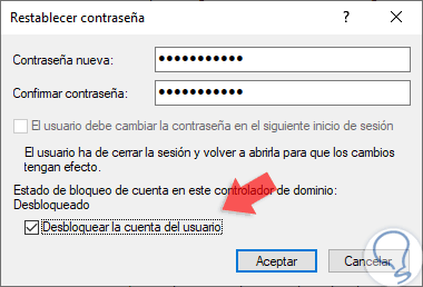 Se desplegará la siguiente ventana emergente donde debemos ingresar y confirmar la nueva contraseña. Además, será posible activar la casilla “Desbloquear la cuenta del usuario” en caso de que esta haya sido bloqueada por intentos fallidos de acceso. Con la casilla “El usuario debe cambiar la contraseña en el siguiente inicio de sesión” obliga a que el usuario afectado registre una nueva contraseña cuando acceda al dominio.