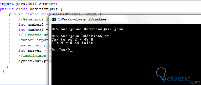 Acá vemos que utilizamos elementos ya conocidos y bastante sencillos, primero importamos la librería Scanner para poder capturar los datos de entrada, luego obtenemos nuestros números de forma aleatoria tomando el valor de los mili-segundos actuales; posteriormente hacemos la pregunta al usuario con la operación y cuando recibamos un valor hacemos la comparación e imprimimos si es true o false.