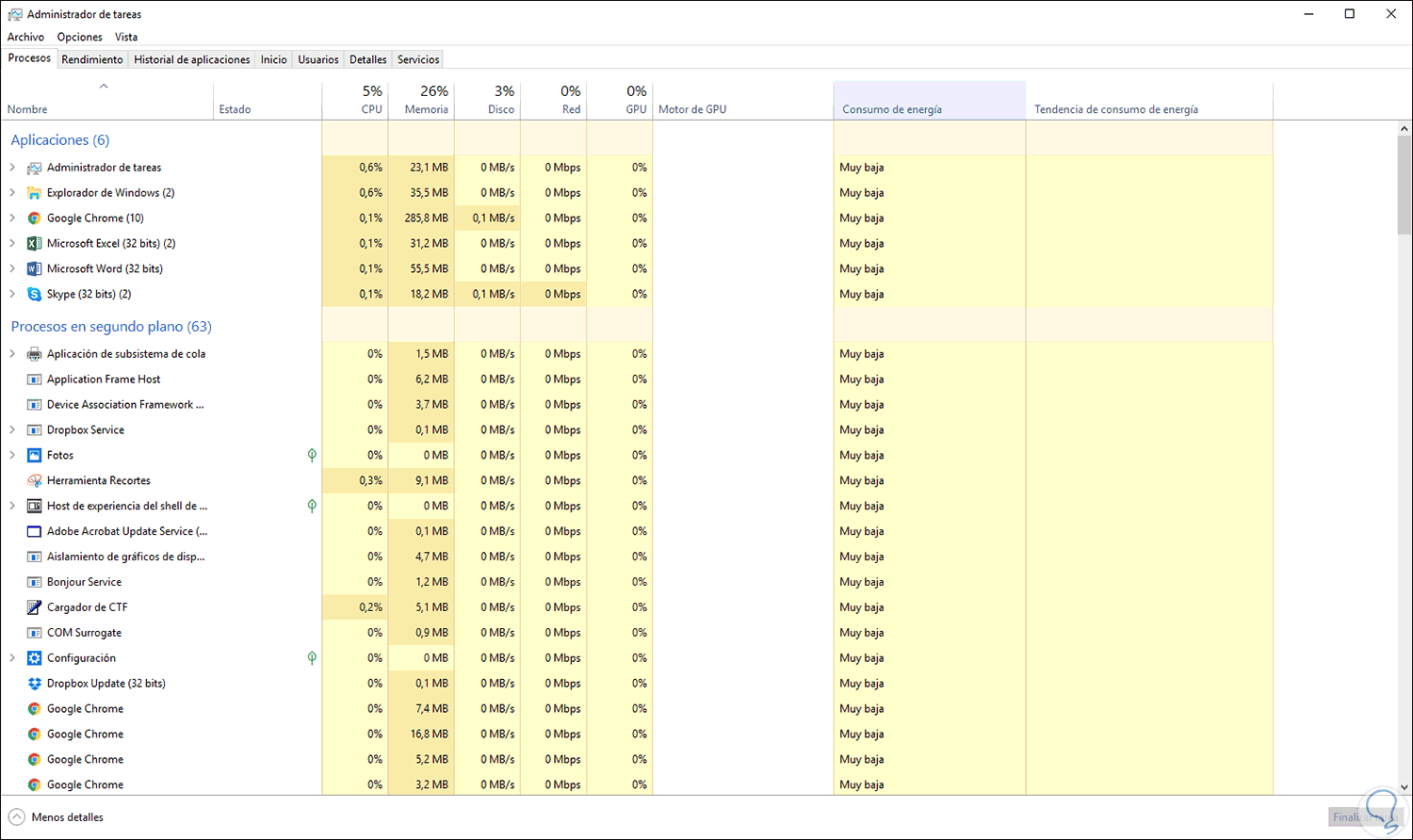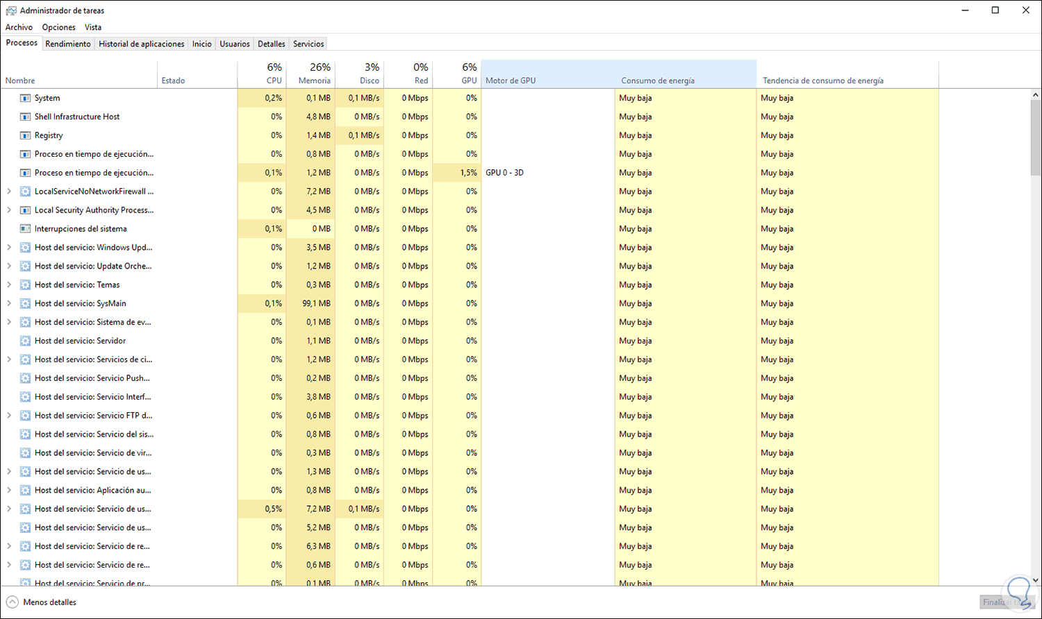 En la columna "Tendencia de energía" será posible detectar, después de un tiempo de uso, cual es la tendencia o el factor de uso de energía de ese proceso en particular. Esto ayudará a las tareas de administración y soporte para detectar cualquier fallo o alto consumo de energía y de este modo tomar acciones directas sobre este. Poco a poco esta información se ira almacenando con el fin de ayudarnos como usuarios de Windows 10 October 2018 a detectar si un proceso en particular, o en su defecto algún servicio, hace uso indebido de la energía.