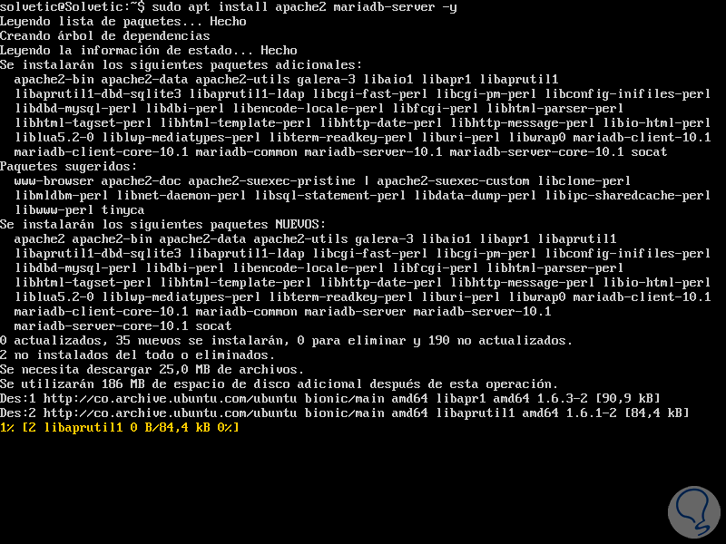En primer lugar, vamos a instalar el servidor web Apache y MariaDB con el siguiente comando:
