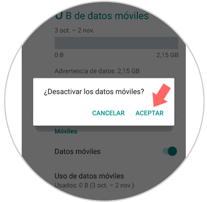Veremos que aparece una pestaña emergente en la que debemos confirmar que queremos desactivar los datos móviles pulsando en “Aceptar”.