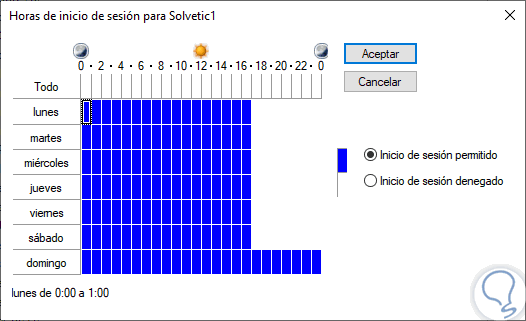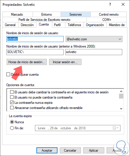 Podemos ir a la pestaña "Cuenta" donde veremos lo siguiente. Si deseamos pulsamos en el botón "Hora de inicio de sesión" para definir en qué rango horario el usuario tendrá permiso para iniciar sesión en el dominio.